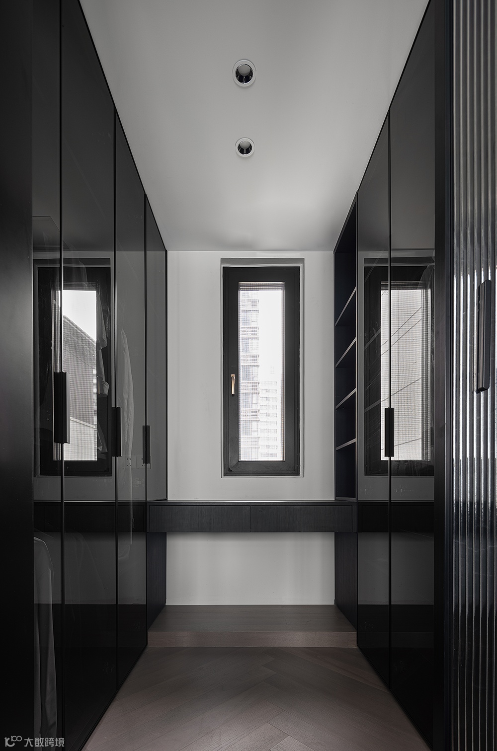 主卧旁边是衣帽间,衣柜分列两侧,中间留有宽敞的过道用于取物换衣。