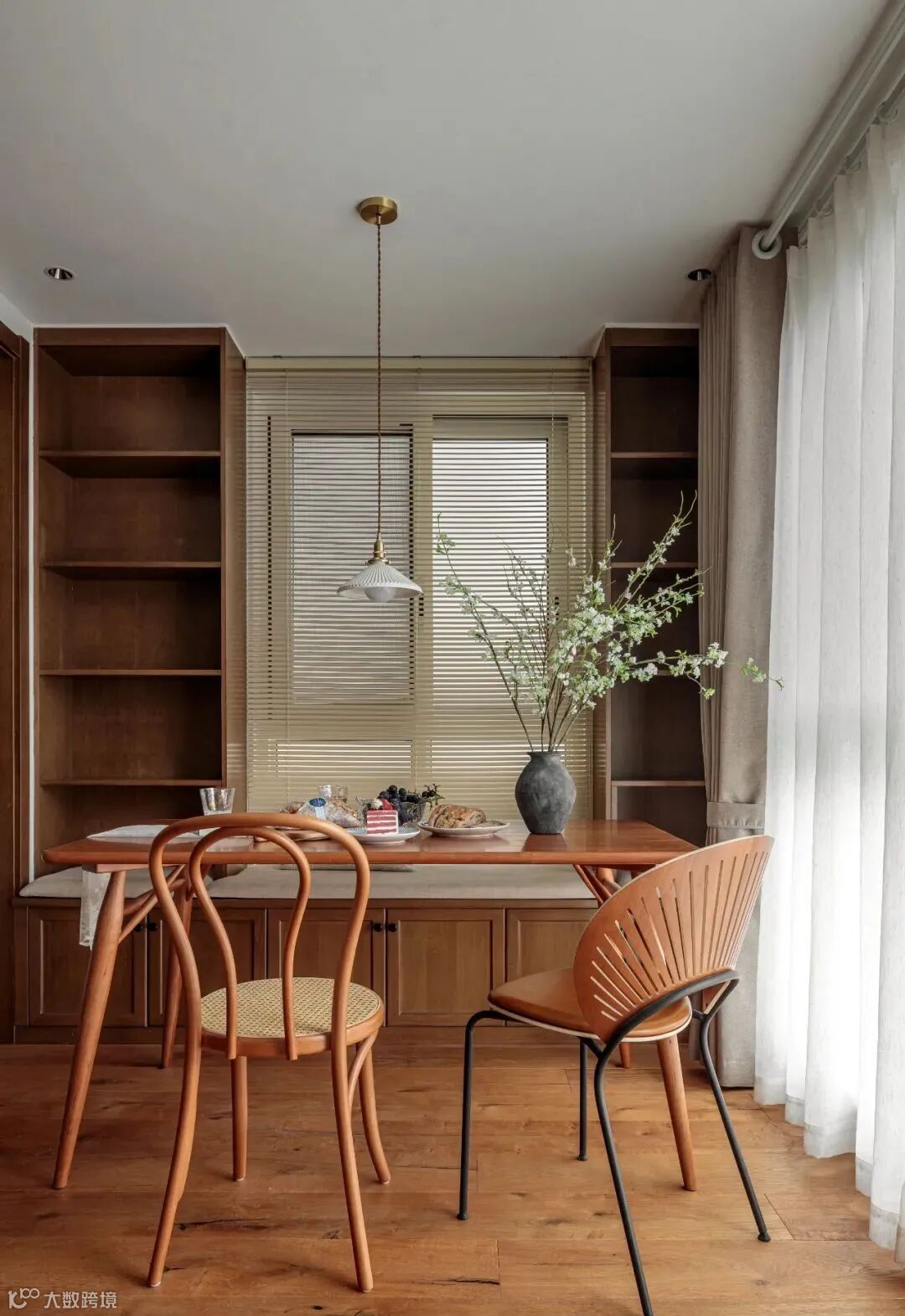 卡座用在餐厅可谓是最常见的做法,在一些家居空间当中,使用了卡座+隔断的组合,不仅可以用来区分餐厅与门厅的不同功能区域,还可以最大程度地让视野开阔,尤其适合于追求小资情调、不甘于常规设计的家庭。
