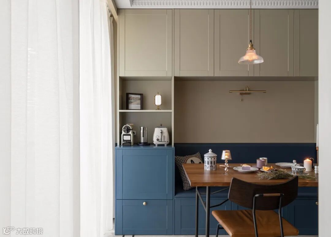合理利用家的每1㎡,卡座上方的空间也不浪费,在卡座上方安装上吊柜,就可以获得一个实用的储物空间。也可以在卡座两侧设置上侧柜,哪怕是只有0.5㎡,装上2米高后,也是1㎡的储物柜了。