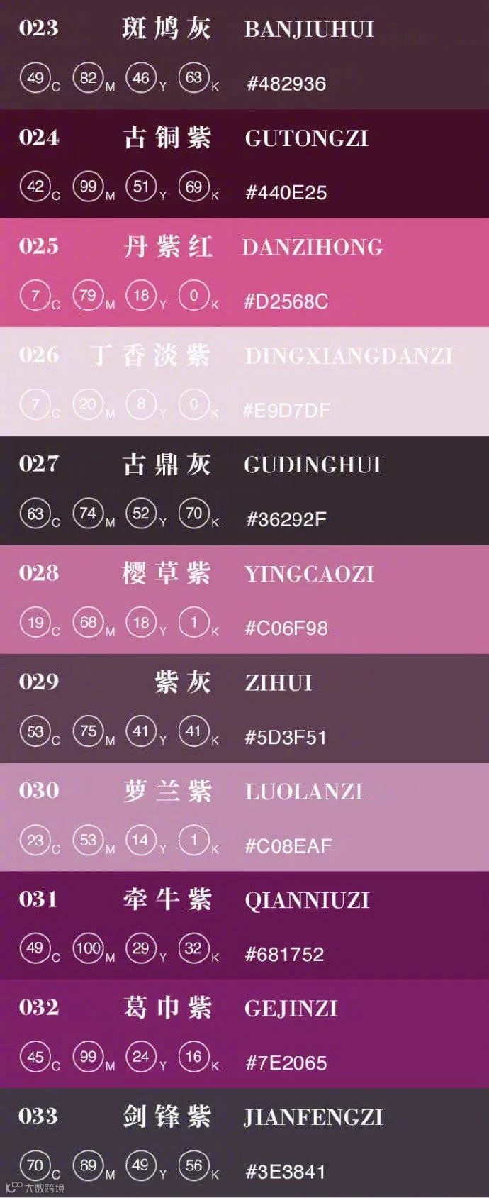 梅染、荼白、落栗、薄柿、酡颜、踯躅、曙色、缁色、鸦青、胭脂、若草、缟、缃色、竹青、苏芳、缥色、