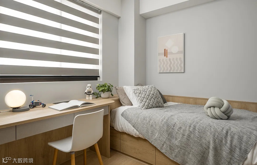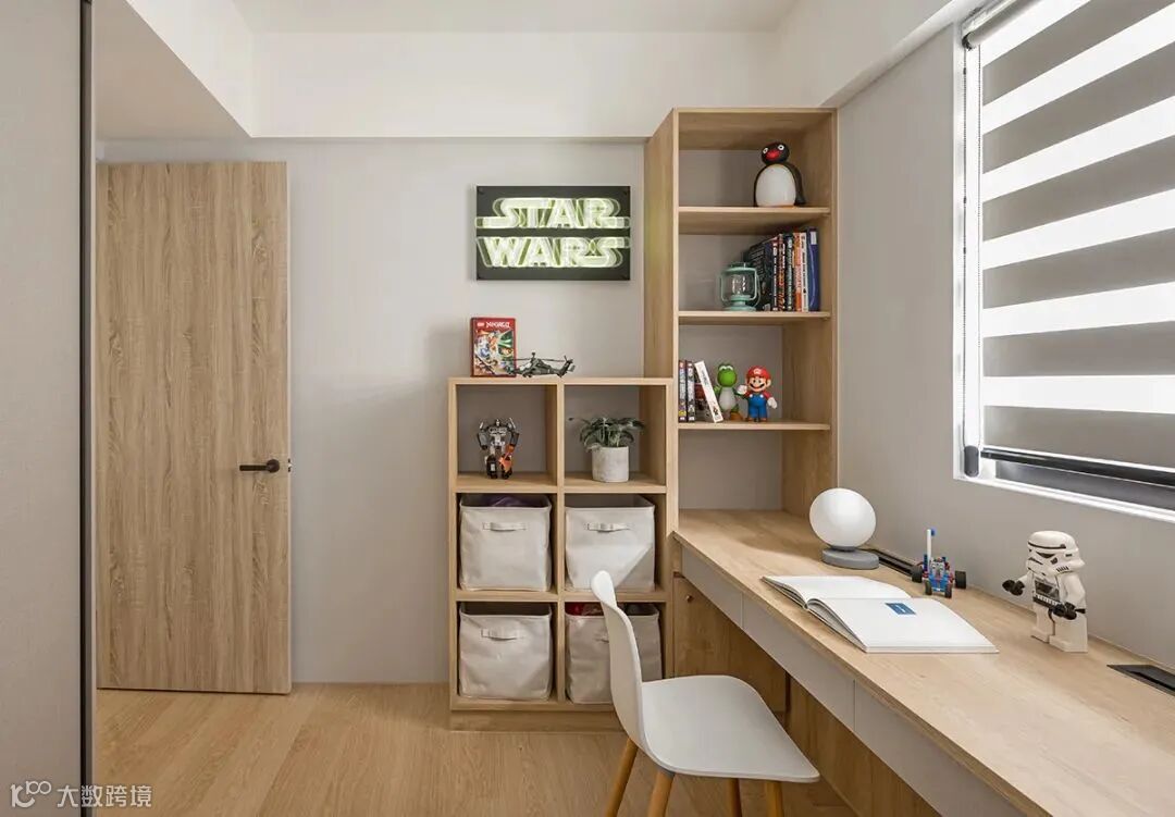 和主卧一样,临窗设计书桌,靠墙打造高低柜,同时满足收纳和展示两种功能。
