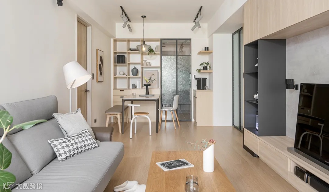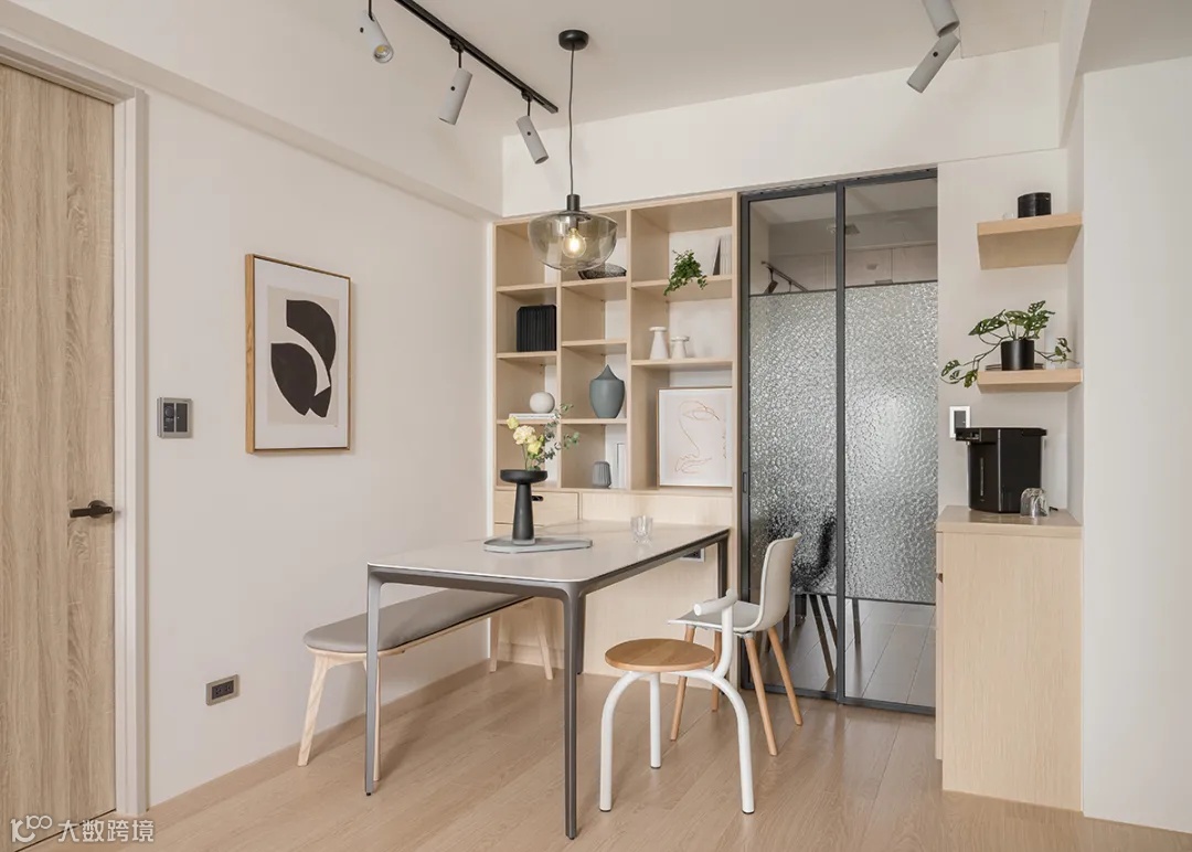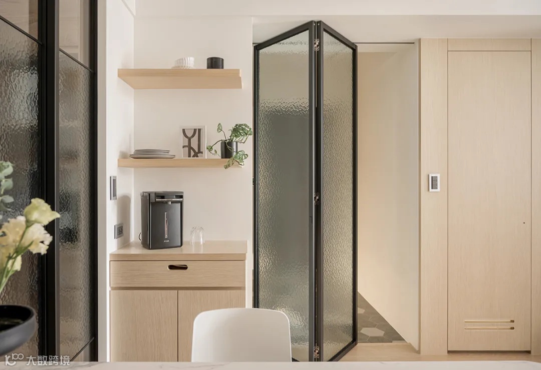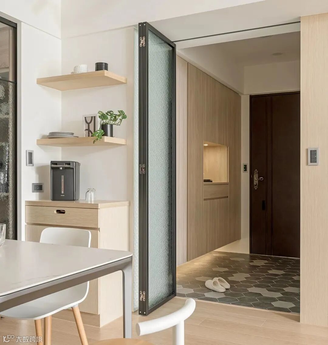 玄关处还设计水波纹折叠门,薄雾纹理虚化,避免开门见厅的尴尬。