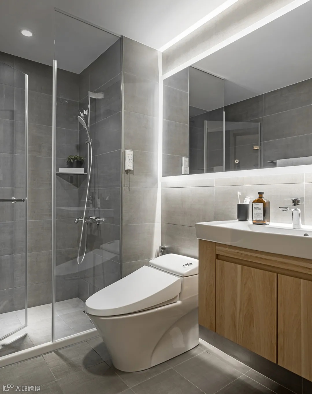 卫生间全面铺贴灰色系瓷砖,稳重大气。淋浴房设计,干湿分离,使用更方便。