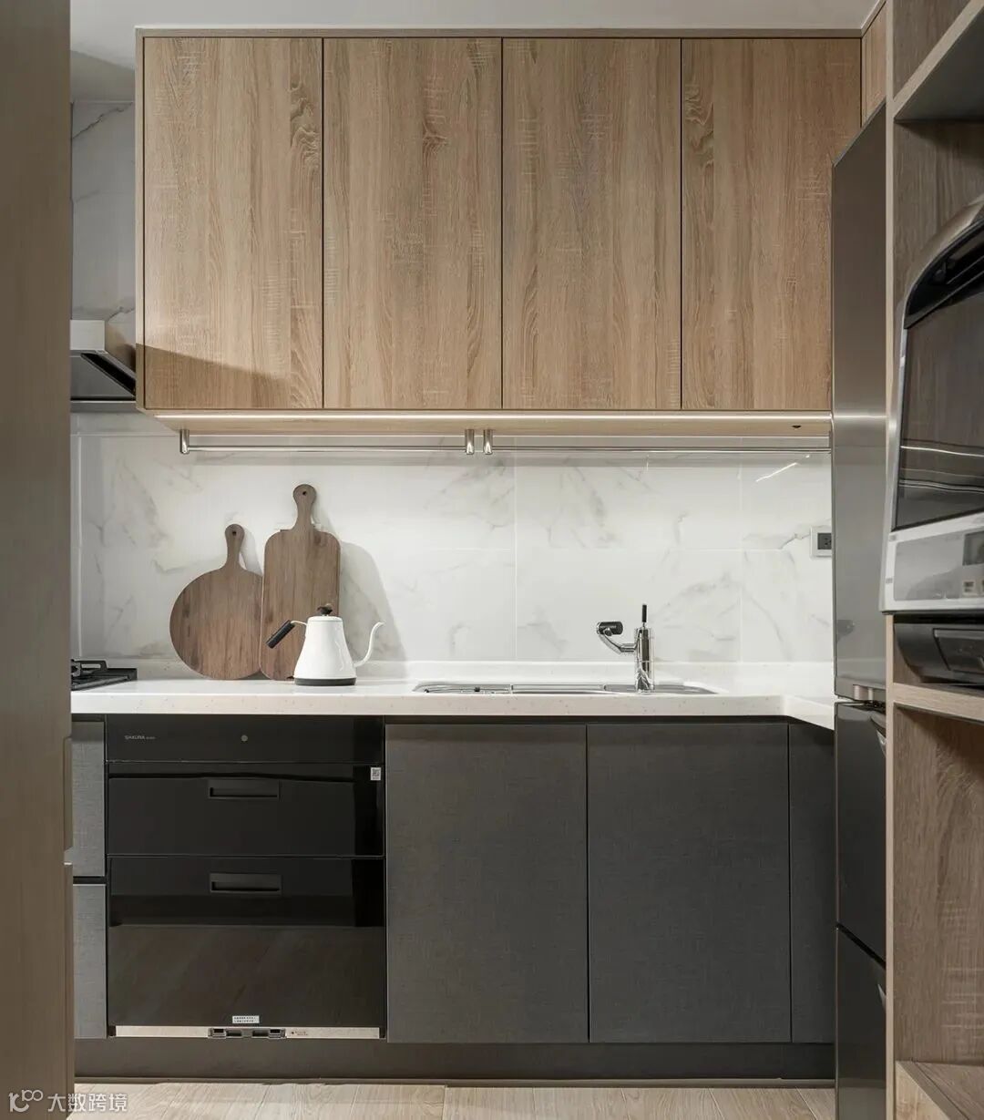 右侧角落空间,以搁板+抽屉腰柜,安然摆放饮水机等小型厨电,勾勒出顺手流畅的使用动线。