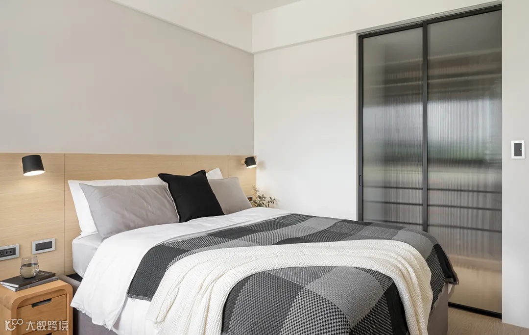 背景墙覆盖一层奶油雾灰棕,并横向推开木质饰面板,带出空间层次。两侧预埋插座,方便平时给手机充电。