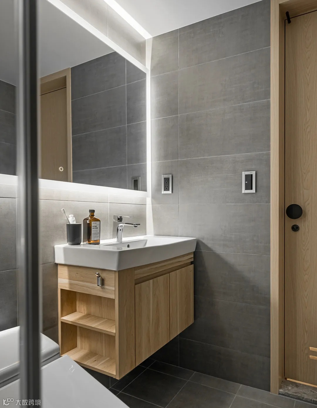 悬挂浴室柜也特意打开侧面,用于摆放纸巾等物品,细节满满。