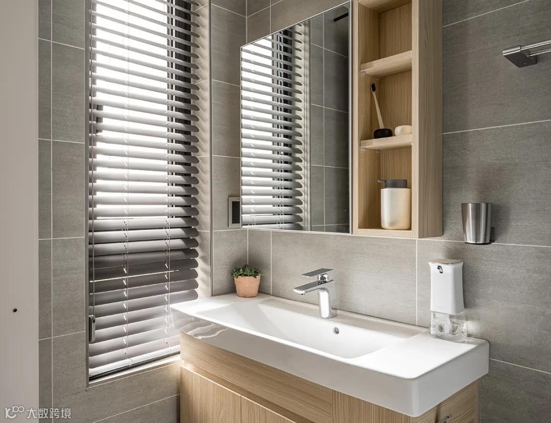 雅灰大板瓷砖奠定主卫的沉稳气质,以5cm宽轴墨黑百叶帘筛撒自然光,量身订制的镜柜,提供充足的收纳空间。