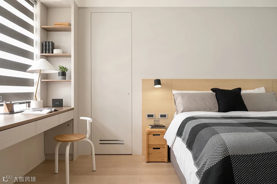 次卧利用板材定制榻榻米床和腰板,通过上掀+抽屉式收纳,提升储物能力。