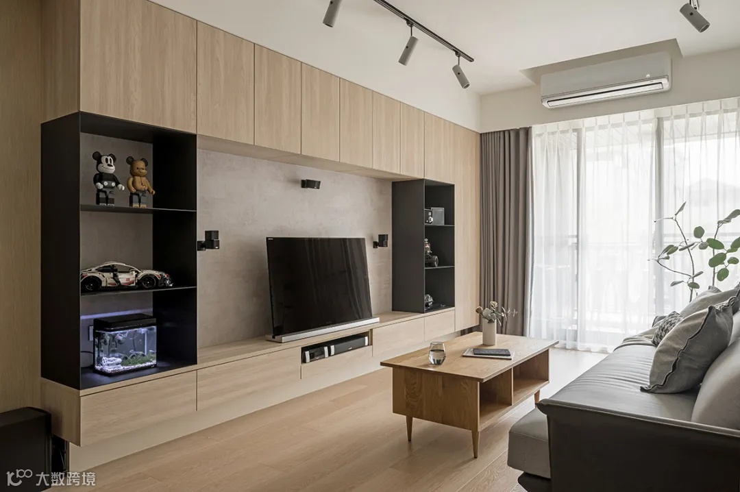 电视墙采用温润木质和轻薄黑铁虚实交错,轻盈又美观。