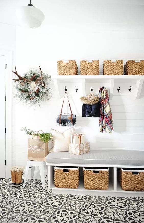 如果家里常住的人数不多的话,更建议只装隔板架,其它的比如板凳或挂钩就不要布置了,直接留白,这样既可以保持空间的通透,整个空间的视觉也会有扩充的效果。