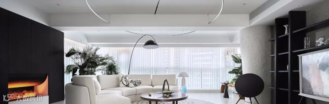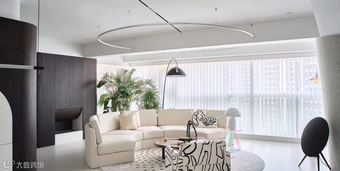 ▲ 围合式沙发对应顶面定制款圆形吊灯,结合嵌入式线性灯将尴尬的横梁融.合到顶面造型中