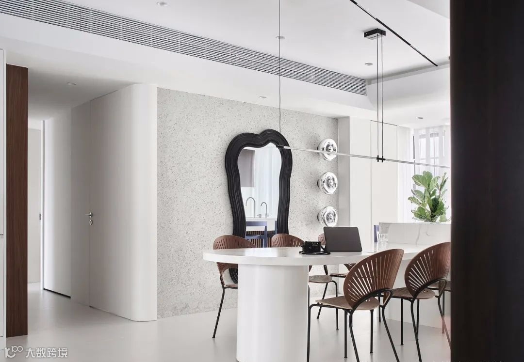 ▲ 粗犷的水洗石元素延伸至餐厅,北阳台归纳至餐厅,让南北空间更通透,定制大餐桌,和岛台组合成连贯桌面,可以轻松容纳10人同时就餐或游戏