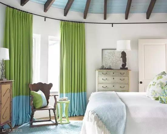 吊顶的蓝色和床上织物的蓝色,床上再加几个同色系的靠枕,房间也能hold住窗帘的大色块
