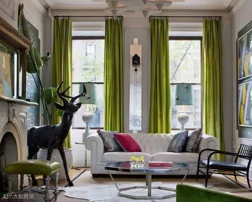 这个客厅存放的东西多,色彩比较杂,挑选色系出现较多的绿色做窗帘,不会太突兀
