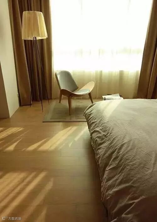 比床单深几个色号的窗帘即照顾了整体色调,又能很好的遮光,很适合卧室,低调又实用