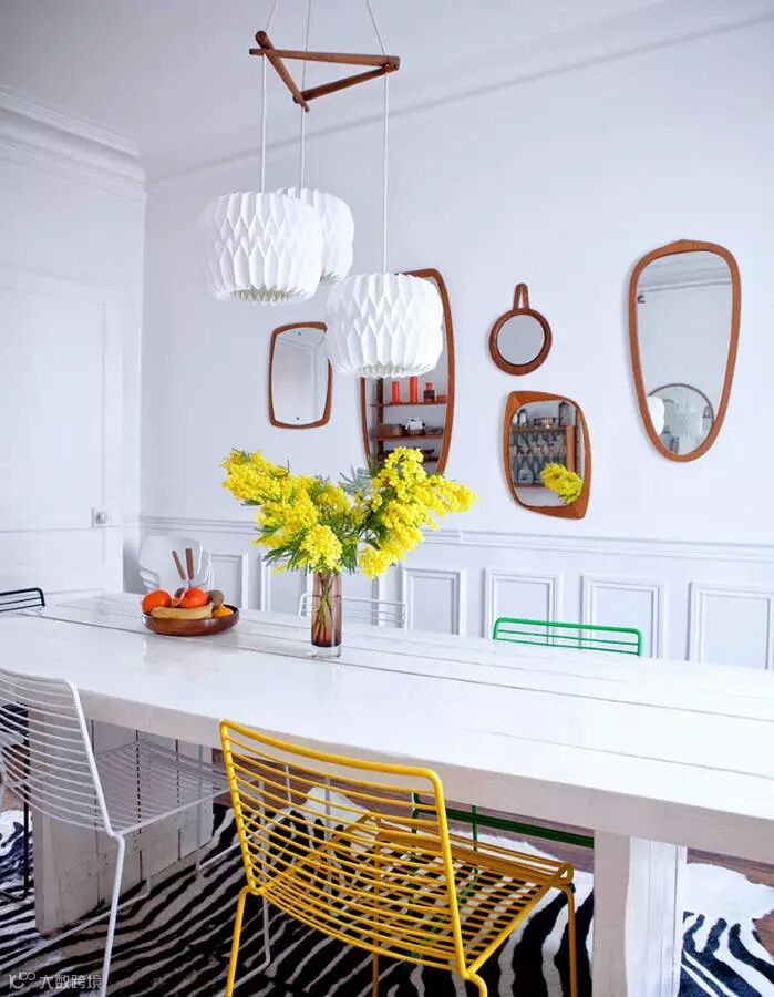 您可以将几个小镜子挂在任何一种材料的框架中 - 例如木头,而不是墙上的绘画和海报。镜子的形状和尺寸可以变化。