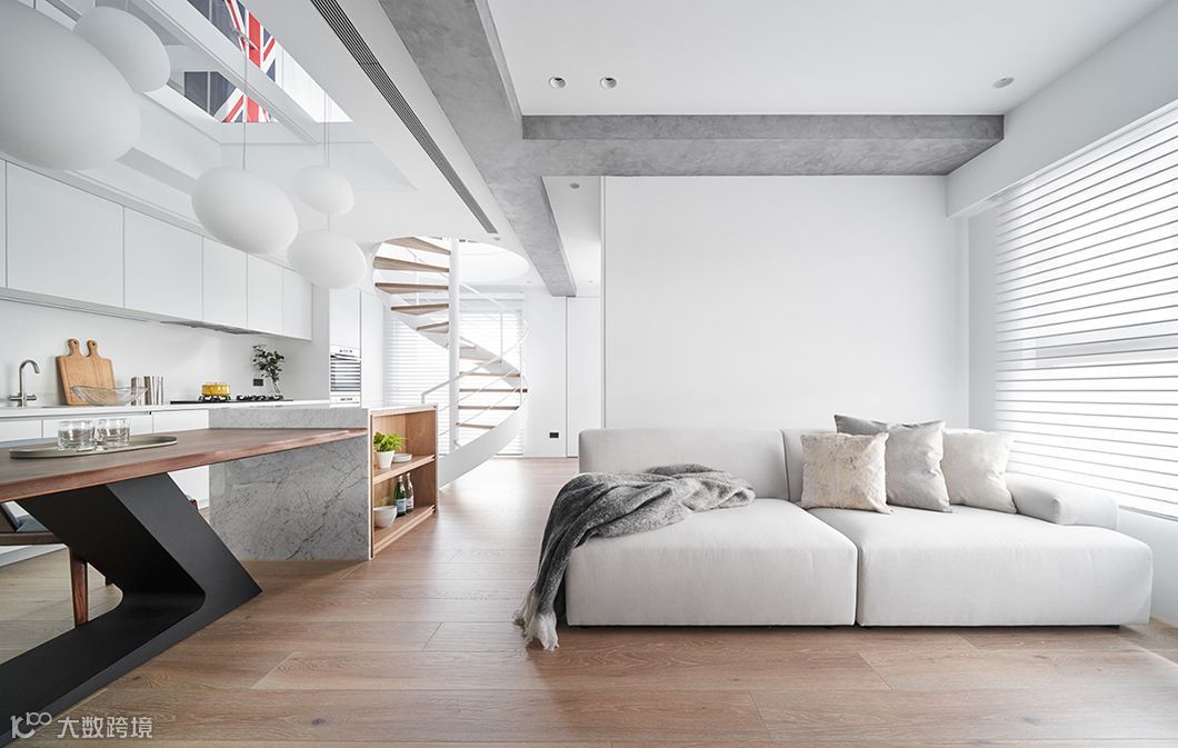 移植纯白北欧生活感,团队精心调整黑白灰比例,白色呈现于大面积饰墙、收纳柜与楼梯结构,经由金属、大理石异材质烘托光影层次变化。