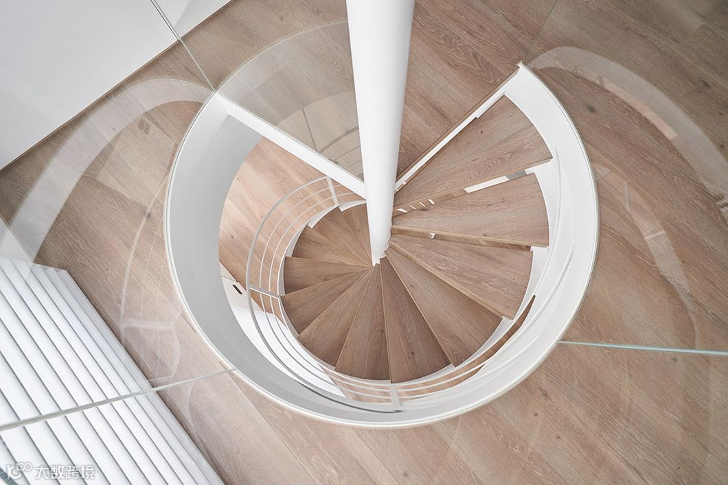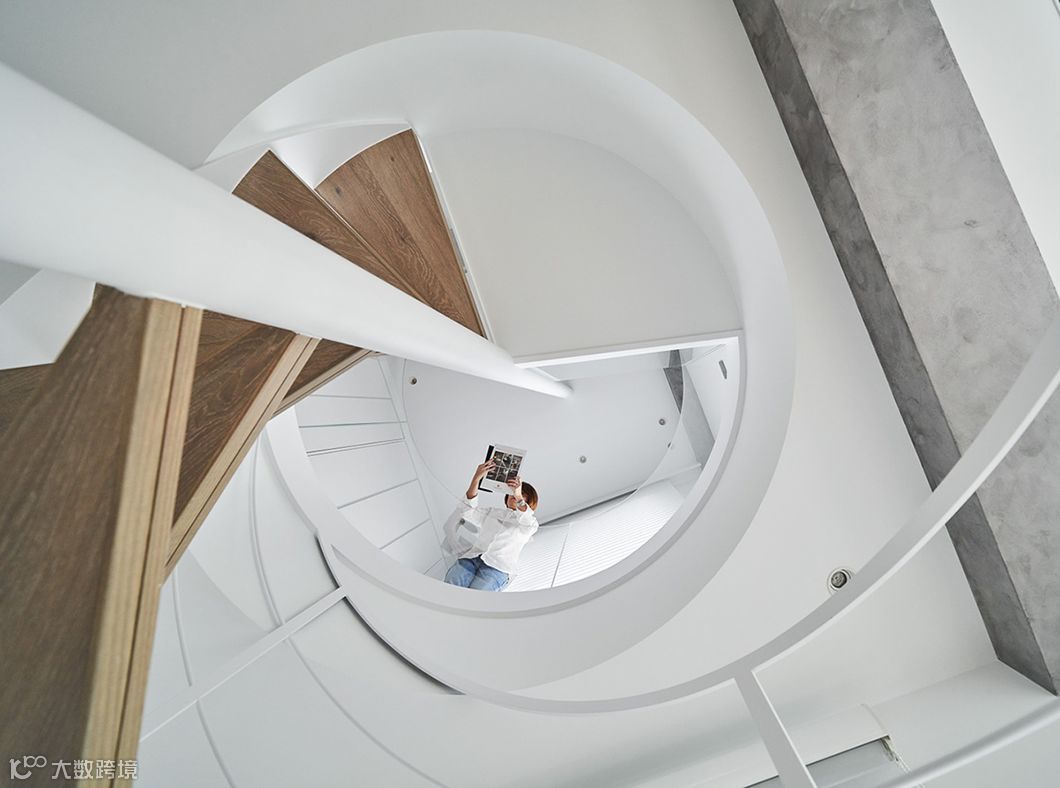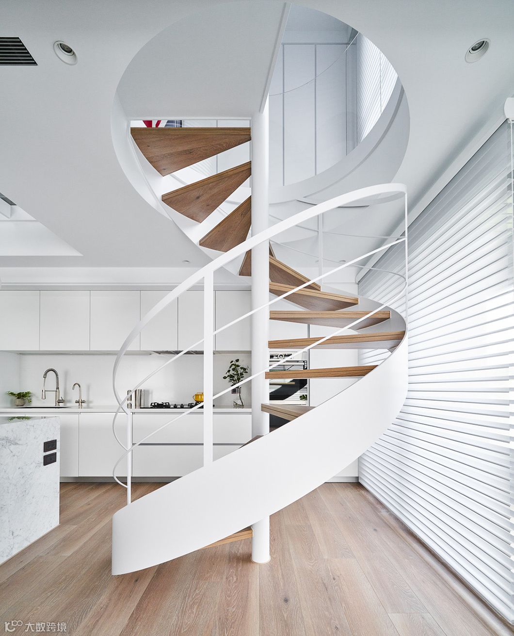 外型优雅,也考虑安全与机能,男主人身形较为高大,特别精算螺旋状木质脚踏板高度与尺寸,强化安稳牢固、方便走动的梯间构造,使贯穿垂直向度的楼梯兼备安全与美学。