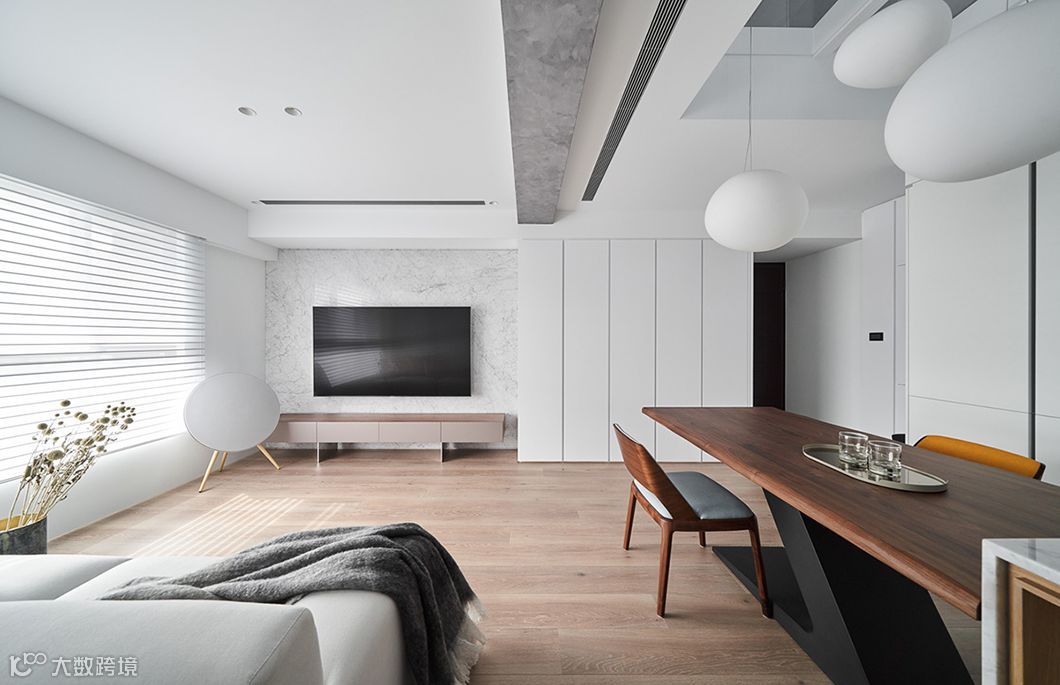 客厅主要诉求简约舒适,以优雅雕刻白大理石布满电视主墙,任其滑面质感烘托自然日光。摆置极简木质影厅矮柜,同步植入男主人喜爱的B&O 音响,延续同色调与材质烘托温润沉静的景致。
