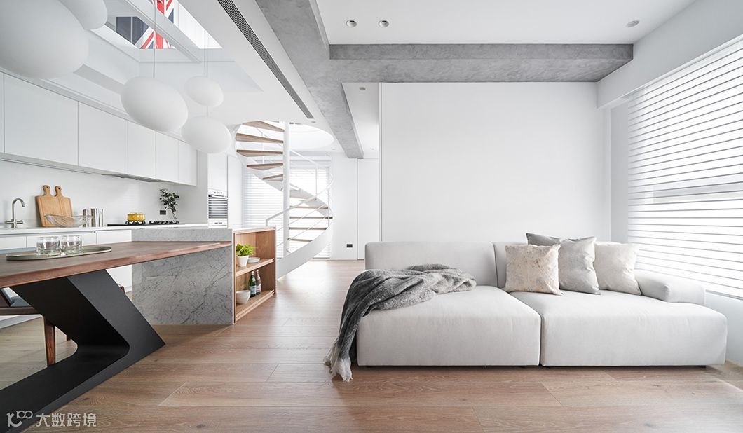 向往在家中拥有无拘束的空间,在与设计团队过后,以轻盈旋转梯取代垂直动线,藉由穿透楼井串连无拘束的互动距离。