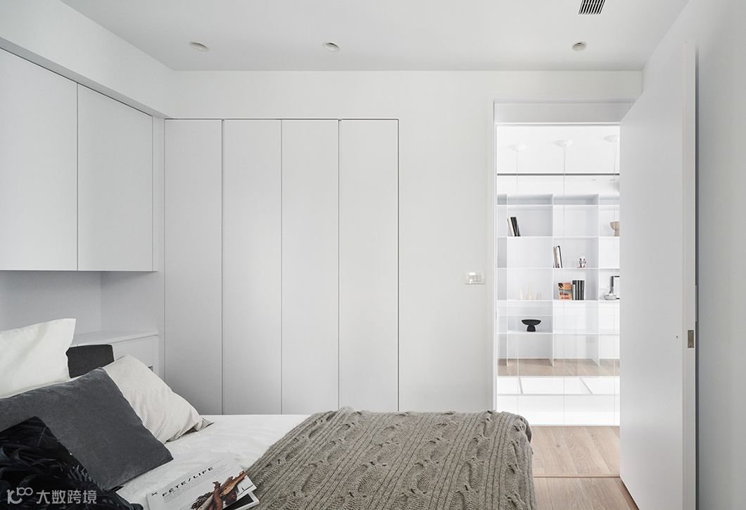 在空间中,我们掌握需机能的需求,共同讨论出合宜的收纳方案。床头背墙横梁推展出封闭悬吊柜与半腰置物平台,大幅提升使用便利度,邻侧则以线缝门片隐匿双人衣柜,营造洁白极简视感。