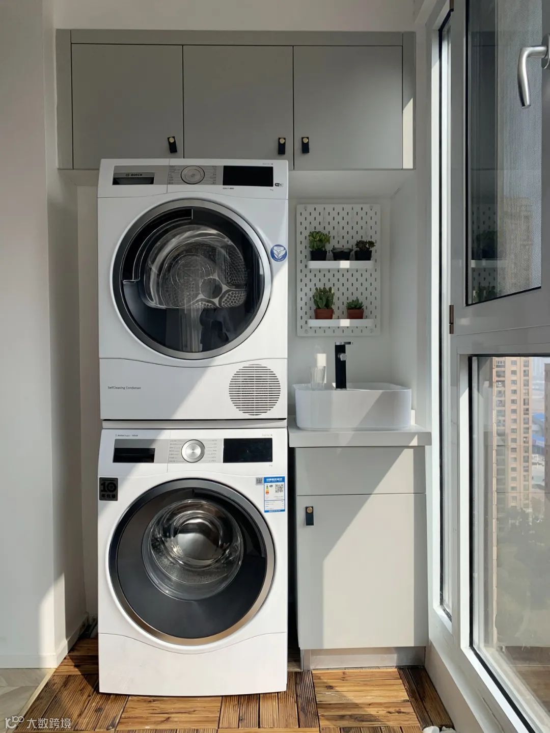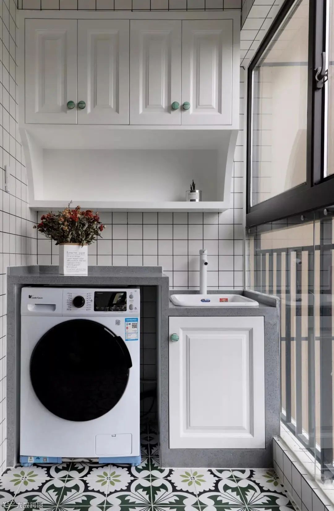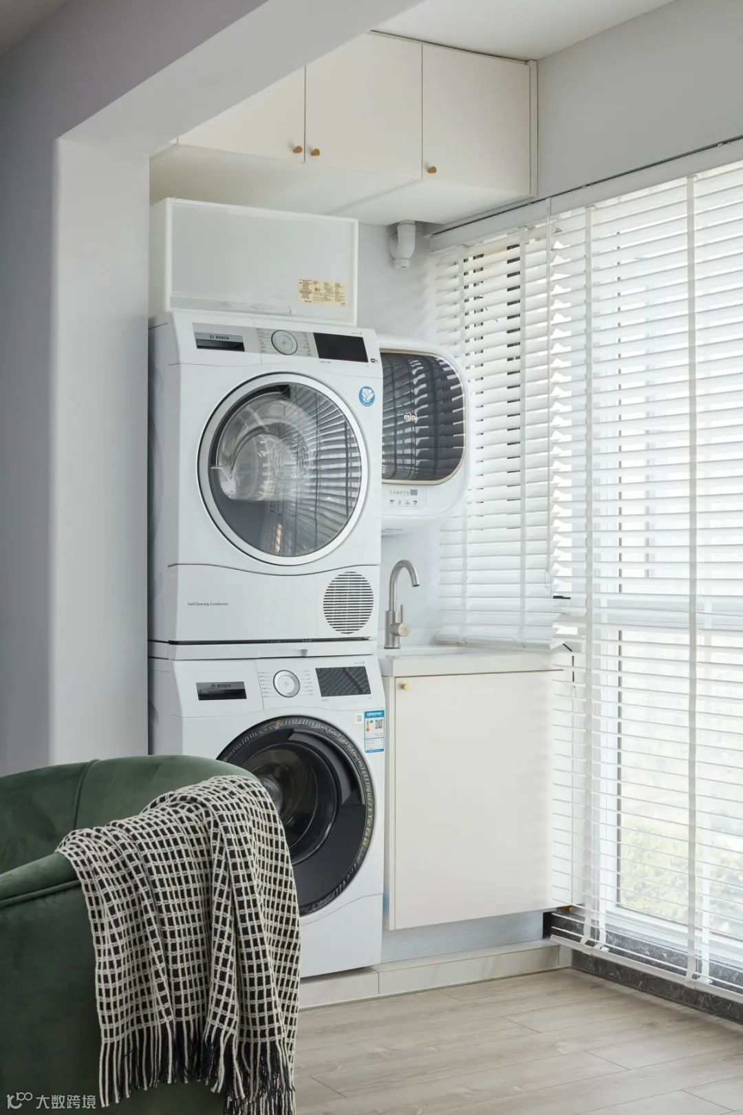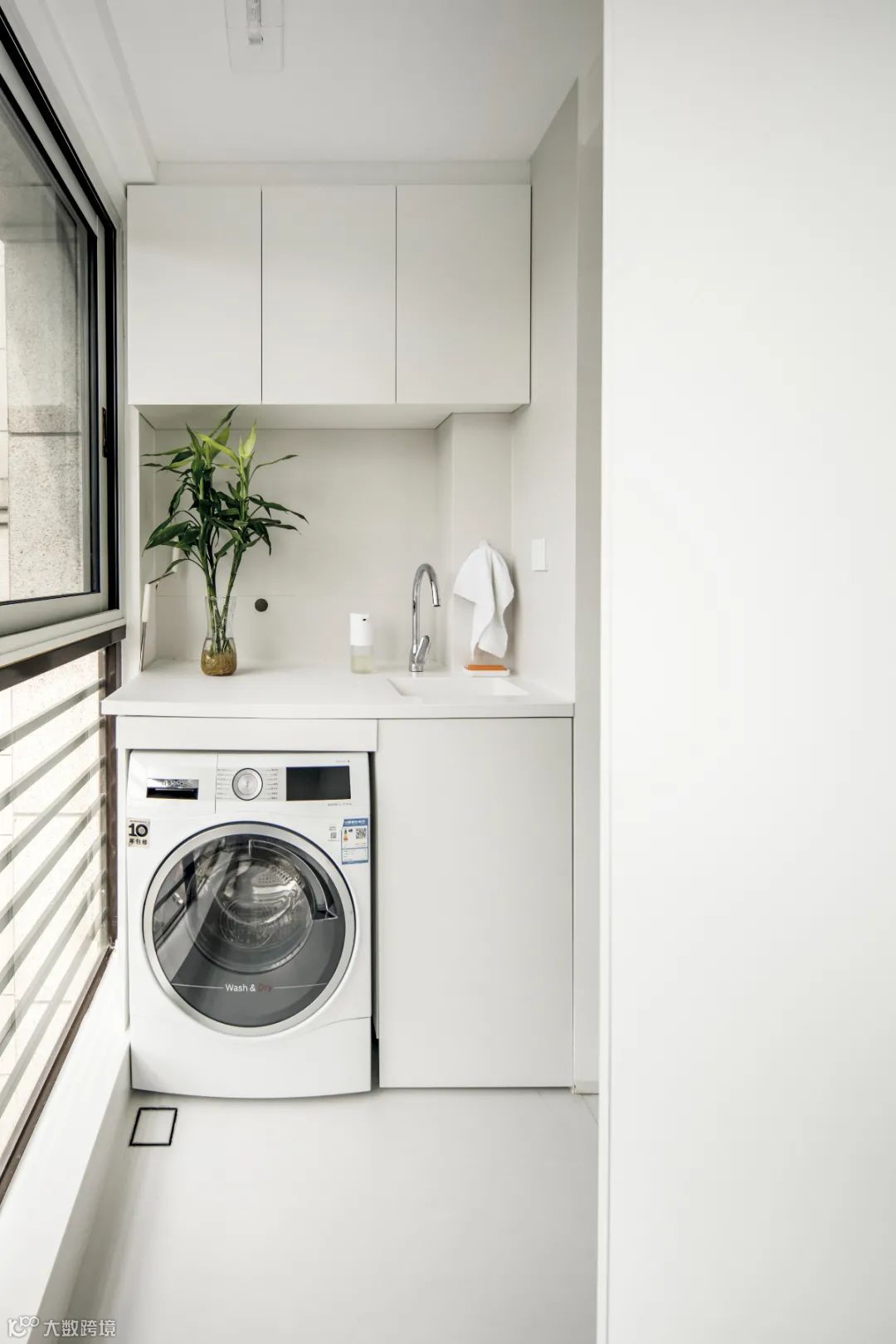 阳台一直都是作为家庭的洗衣晾晒区,将洗衣机结合洗衣柜的设计,不仅解决了洗衣问题,还可以放置洗衣用品和杂物,完美的打造了一个洗晒阳台。