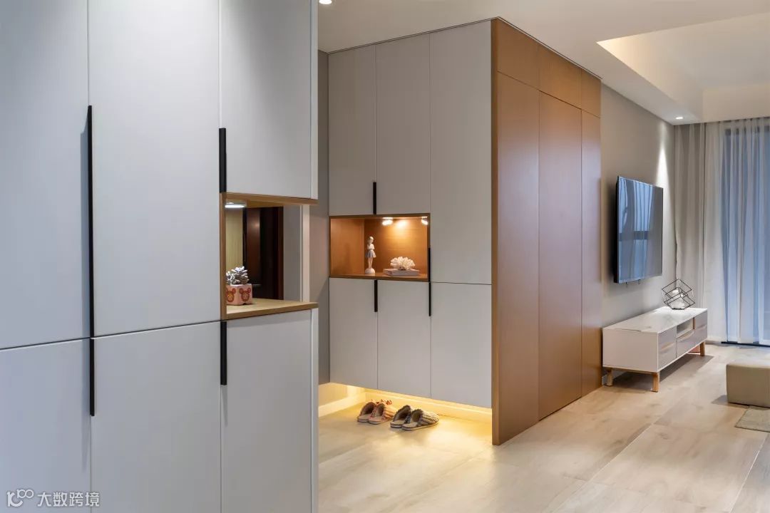 进门玄关处的鞋柜底部跟中部都留了空层,可以放置物品,或者装饰品也可以,还安装了暖灯光,一进门就让人感觉很温馨。