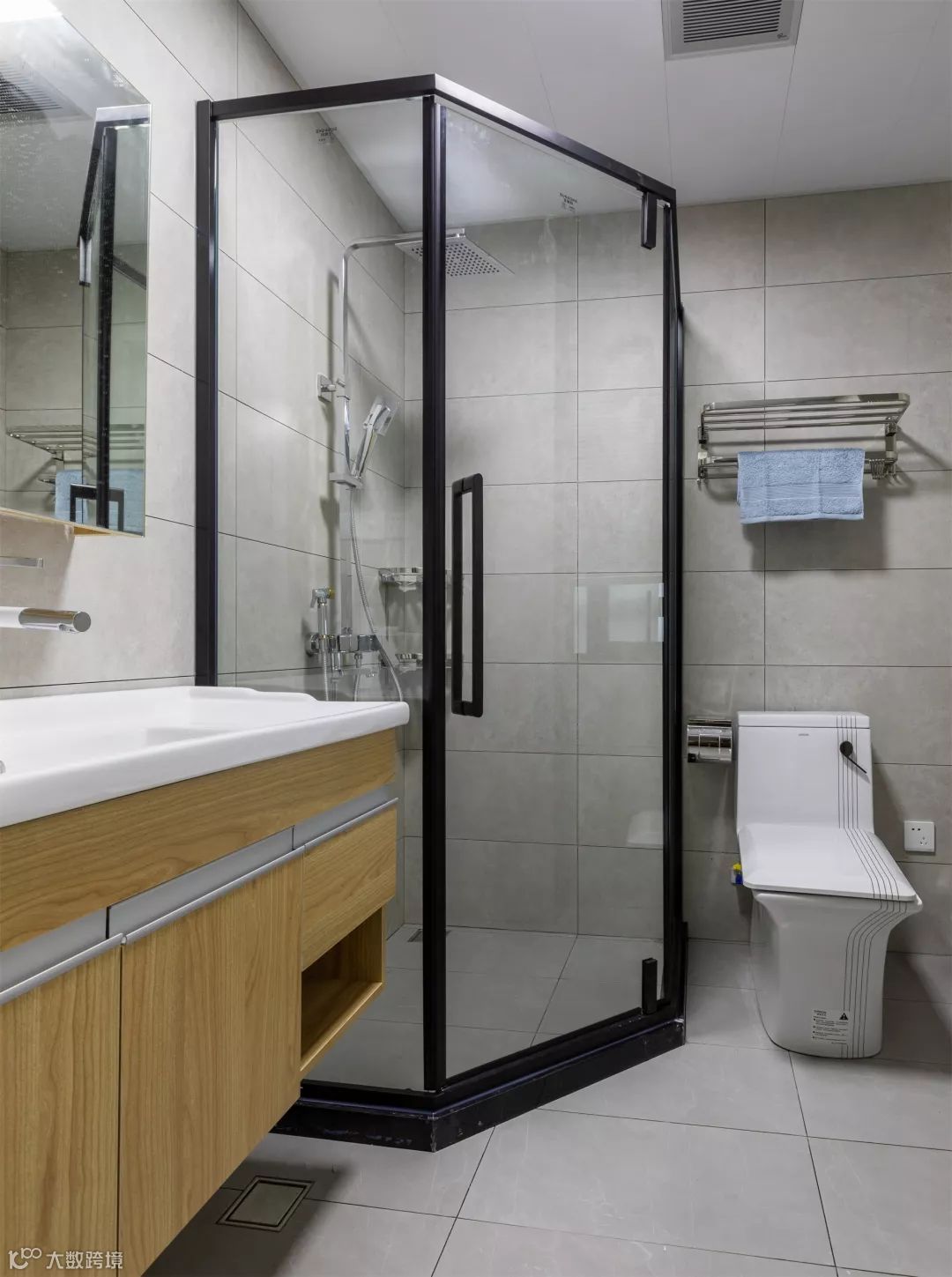 卫生间在哑灰色的空间基础,搭配黑色淋浴房,再布置上木色洗手盆,呈现出一种冷暖交融的对比感。