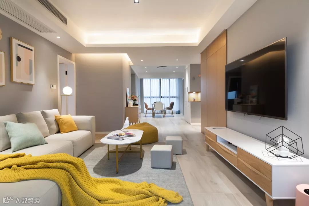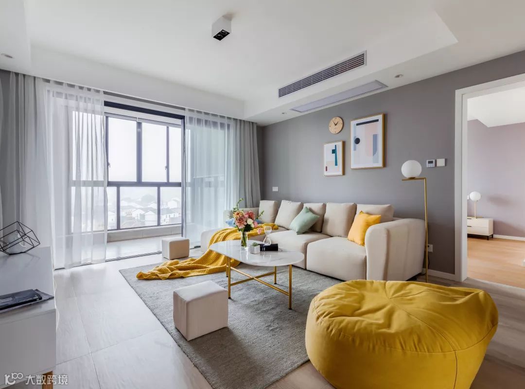 沙发墙的抽象几何挂画、还有时钟,让灰色调的背景墙显得更加艺术气质;米白色布艺沙发,搭配上鲜艳的黄色懒人椅与抱枕软装,在这个简约的空间里显得格外的抢眼,点亮了空间的活泼感。