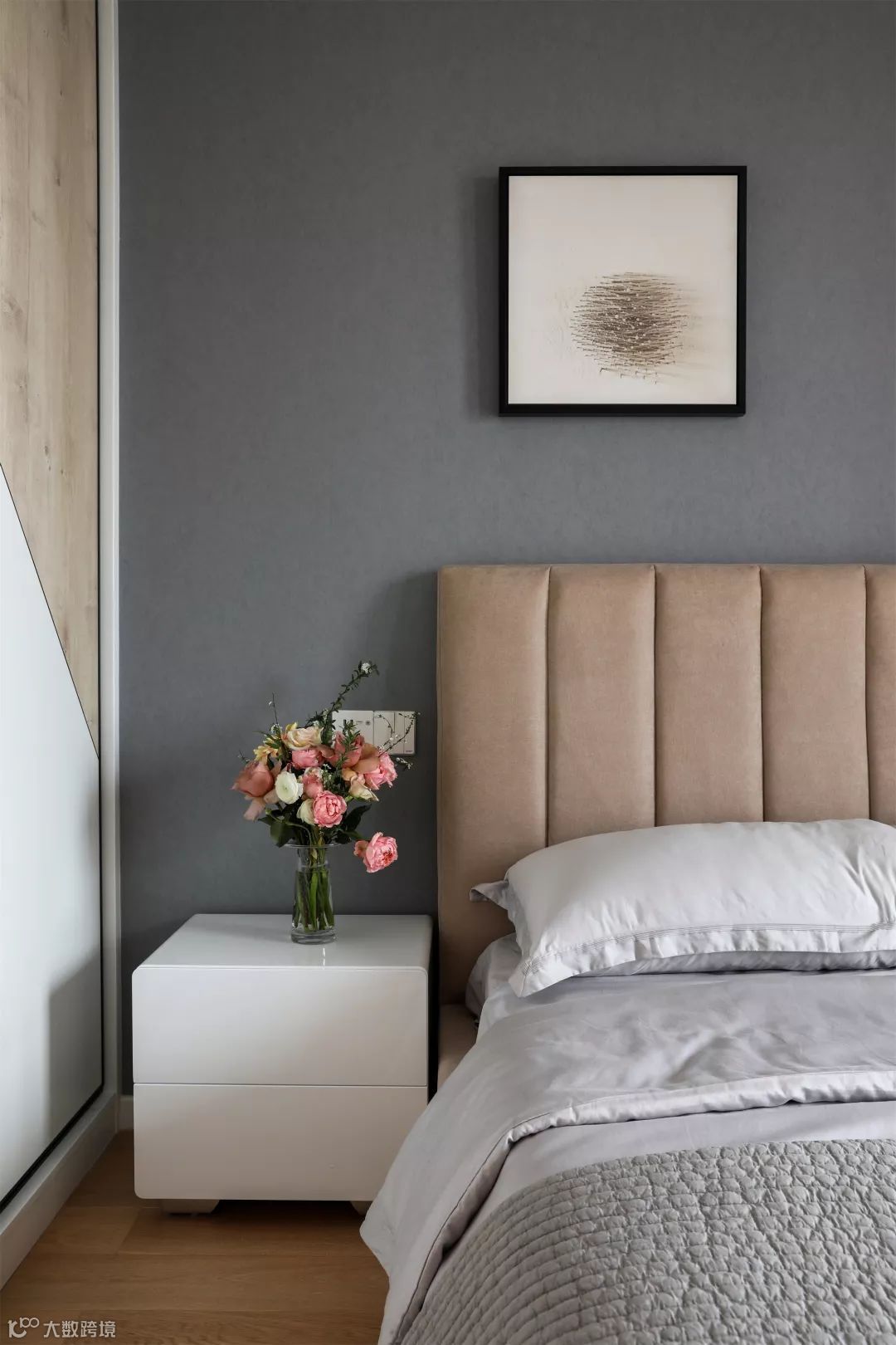 次卧灰色背景墙挂上黑白配的小方幅画,舒适优雅的布艺靠背床、干净简洁的床铺,也为主人提供了一个舒适轻松的睡眠空间。