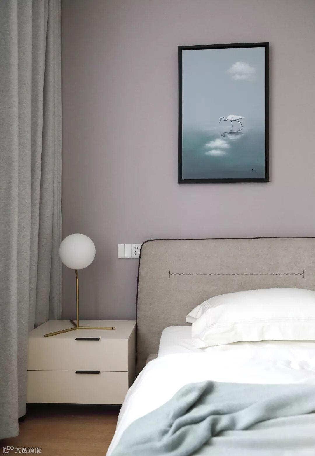 卧室在紫灰色的墙面,搭配上灰粉配的窗帘、灰白配的床单,布置出一种高冷简约的浪漫。