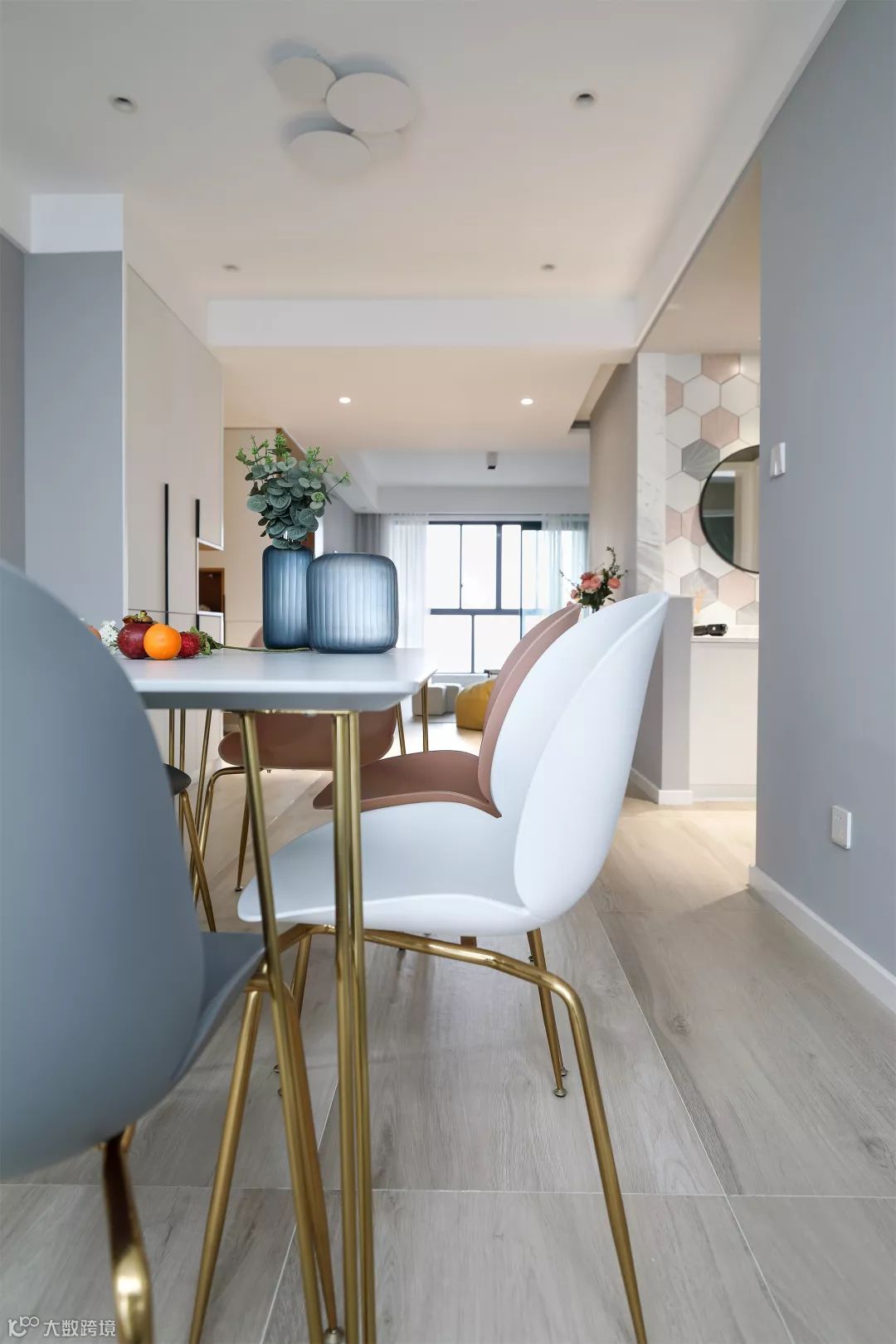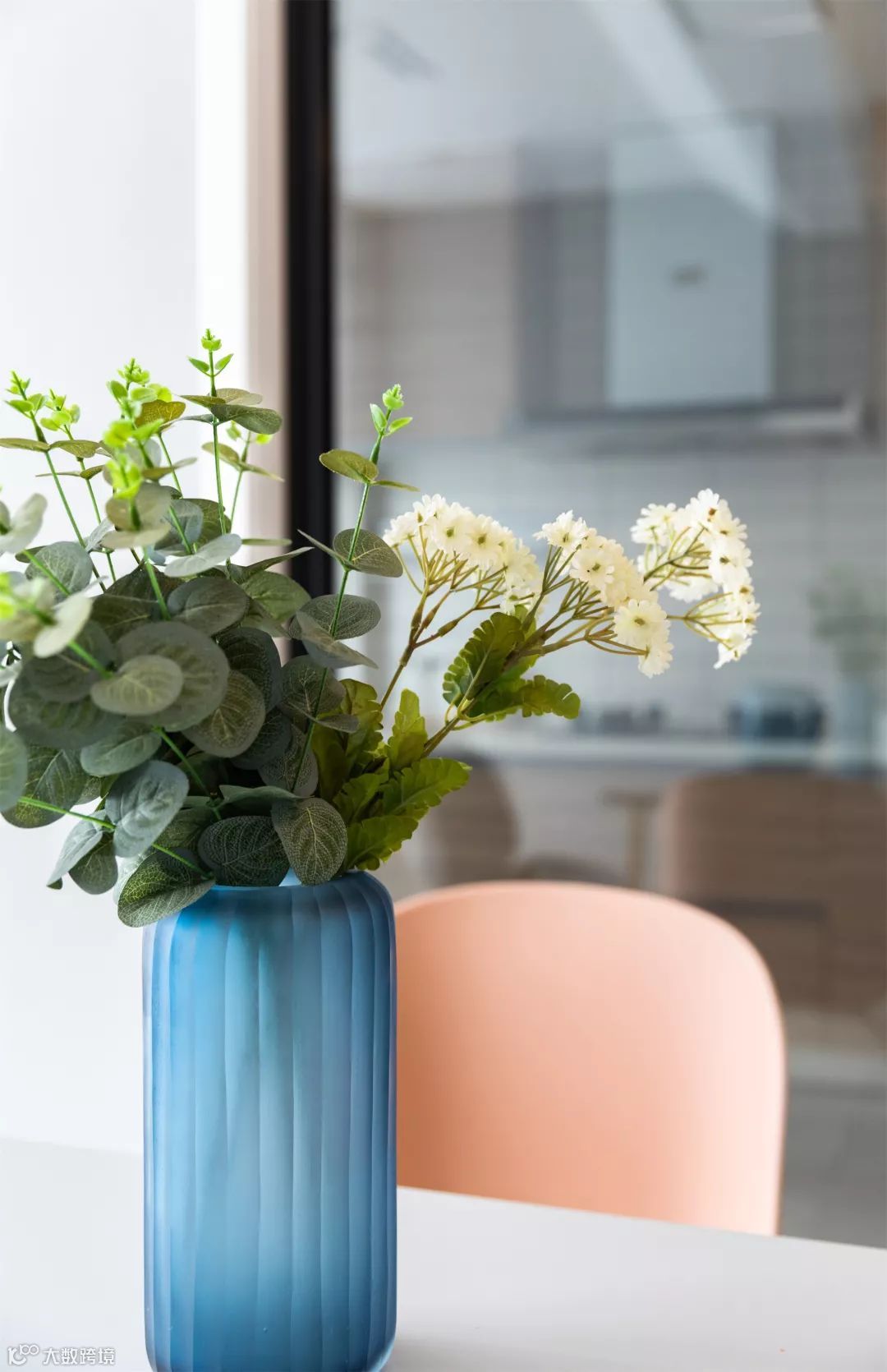现代优雅的餐桌椅搭配,在金属架基础,白色餐桌台面+灰白粉的餐椅,餐桌上摆着蓝色花瓶、再布置鲜艳的插花,带来一个安静与激情的舒适气氛。