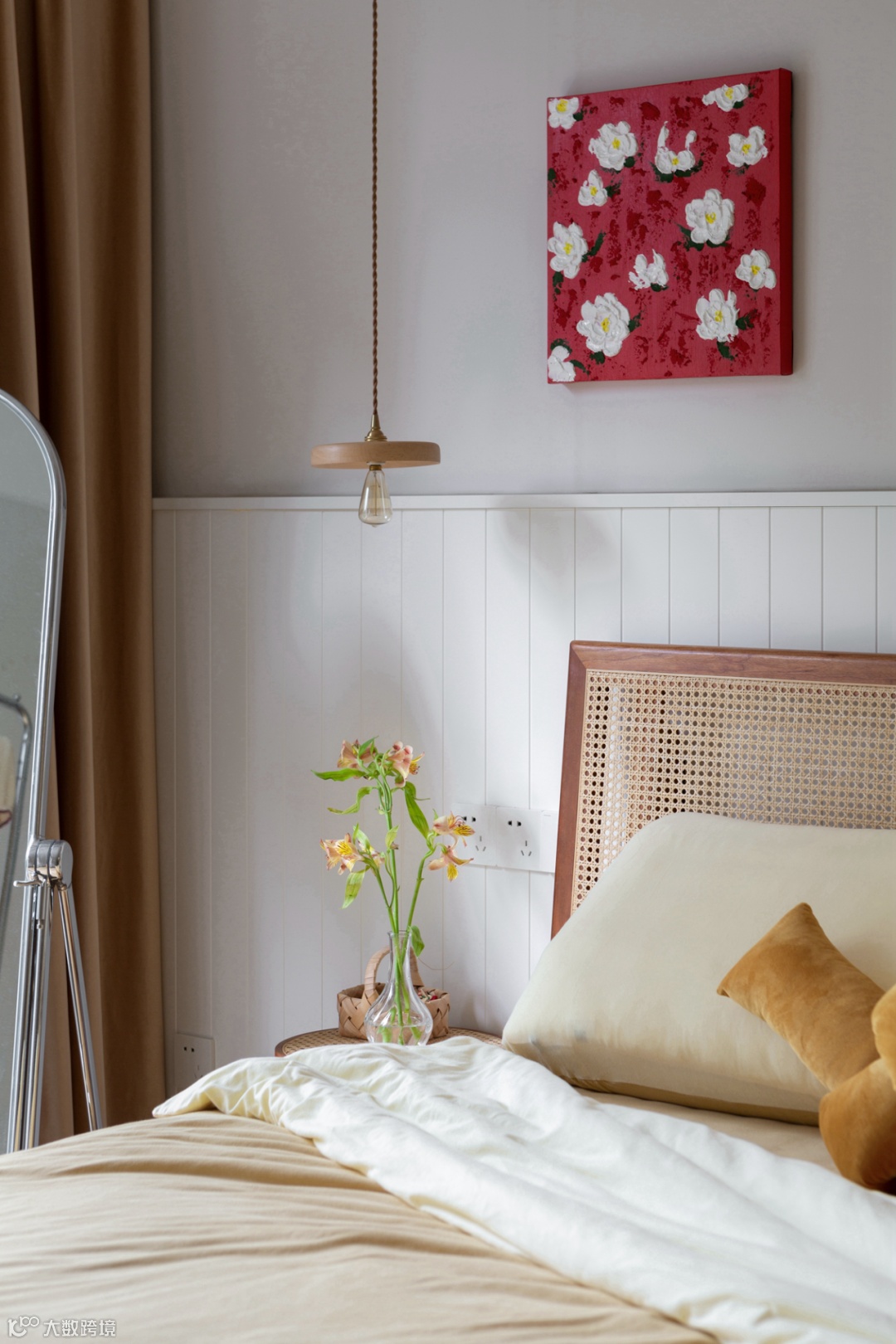 主卧背景墙的木头材质营造出的氛围能够带来安全感,配以藤编材质的床、柔软的布艺、温馨的吊灯,共同糅杂散发出度假般的惬意感受。