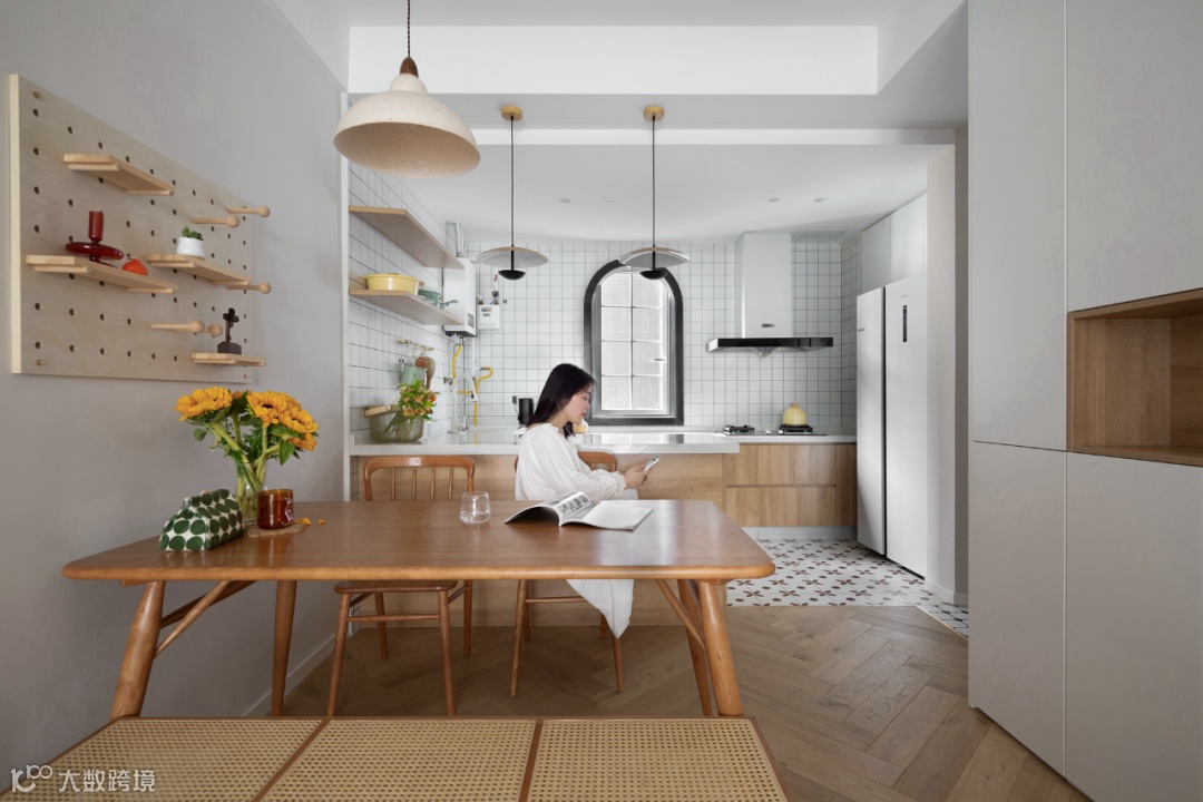 拆除原本的墙体后,餐厅与开放式厨房在动线上形成了一块互动密切的区域。除了备菜台面,还设计了岛台作为功能补充。