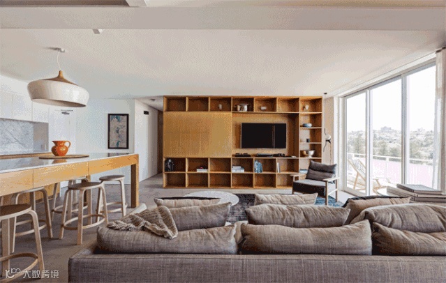 ▶ 地台卡座,地台在电视背景墙一直延伸至玄关、阳台等地,上面当座椅、底下当收纳用。
