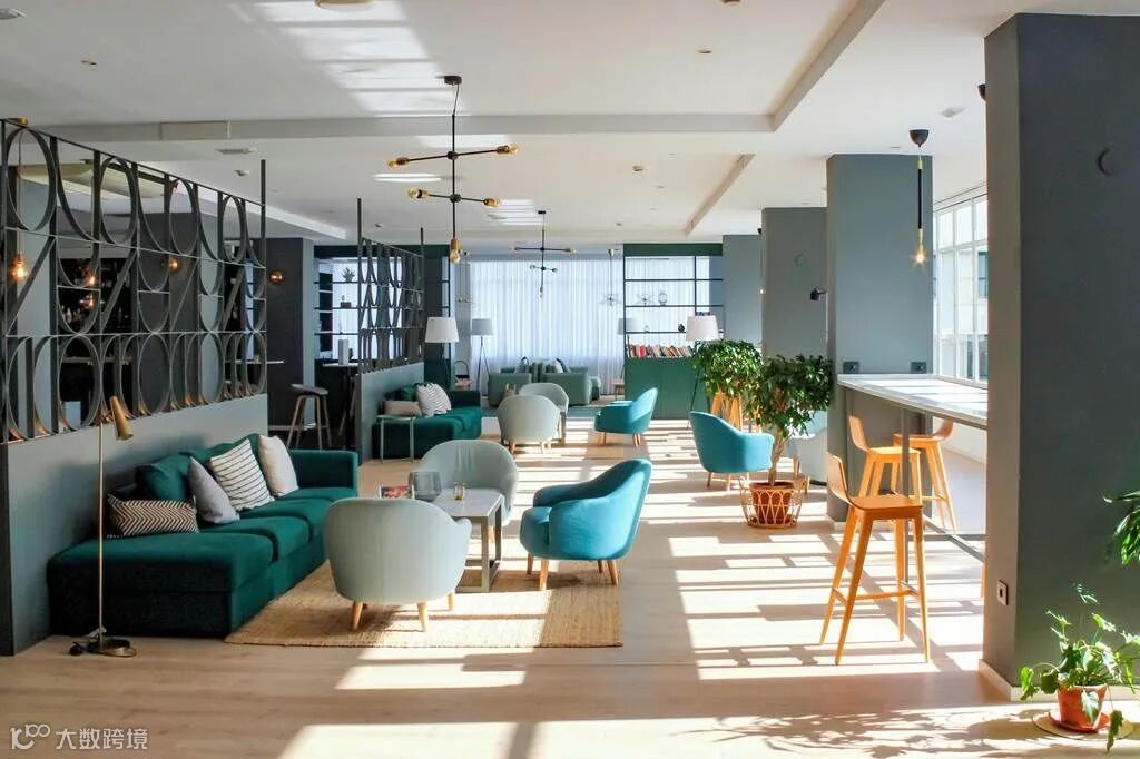 下图酒店大厅使用了灰色打底的空间,里面使用了一些蓝绿色家具。