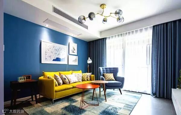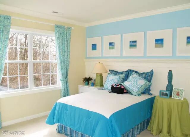 ▼湖蓝色墙纸&深蓝色窗帘,有效的缓解压力和疲劳,循序渐进,富有动感。