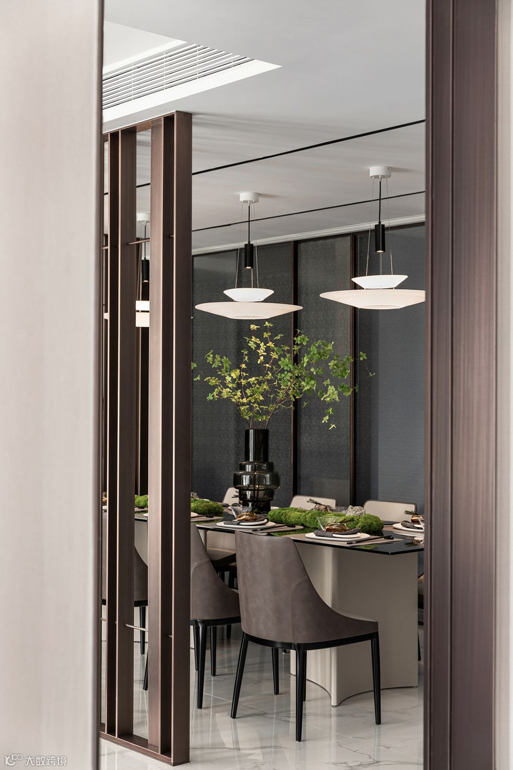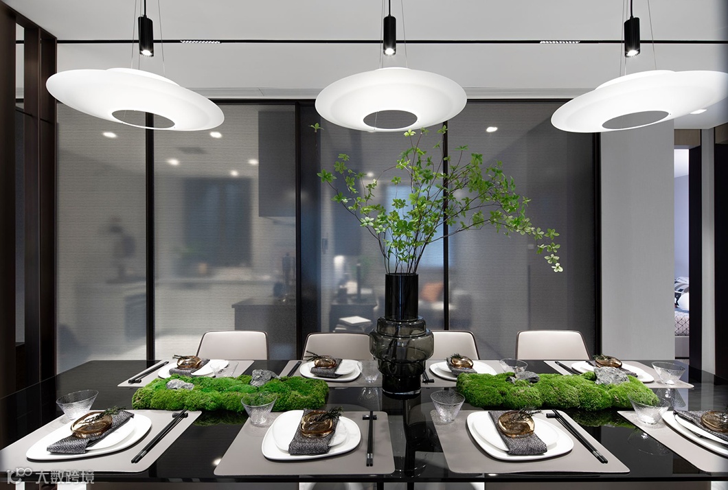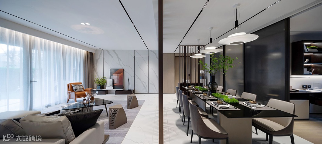 客餐厅位于空间格局的核心,与国人住宅中的待客之厅相呼应。其间若隐若现的线艺隔断既分割了空间,又不完全封闭。流畅的布局和舒适的尺度增添了家人间的交流互动,同时也为日常的社交活动提供了恰到好处的生活场景。