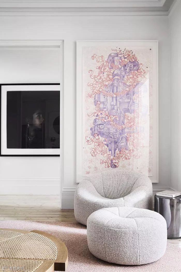 想要一种平静祥和的氛围?考虑一下这种白色,淡蓝色中带有微妙的灰色和中性色调。然后引入一些柔和的灰色、白色、粉色和红色,就像这个客厅角落所展示的一样。咖啡桌自然、随意的材料,单人沙发和奥斯曼的柔软形状与光滑的金属口音、大胆的摄影和独特的、异想天开的墙壁艺术形成了很好的对比。