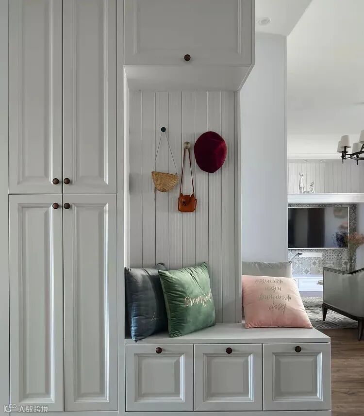 如果是不规则的户型,还可以这样设计,入户处没有完成靠墙,设计挂勾方便挂衣服之类的,靠客厅转角的地方可一下艺术品,装饰品,非常的漂亮。