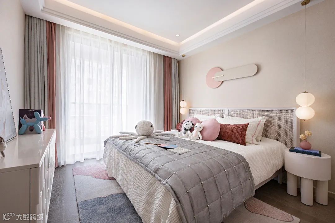 粉蓝色统筹着女儿房的空间视觉美感,各式各样可爱精巧的摆件陈设,线条丰富的家具搭配,在空间中对话碰撞,表现出饱满而趣味的明快气质。线条简约的和风柜面装饰和挂画,掩映着柔和的粉色色调,贴心匹配小女儿活泼可爱的格调喜好。
