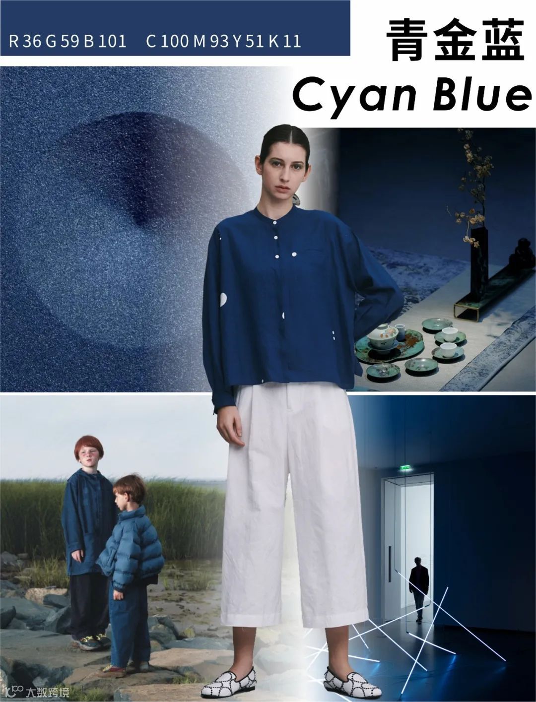 工装回潮之下,青金蓝是男装系列的常用色彩;在2022秋冬主打蓝色调,整体更接近纯正的天然靛蓝色。呼应着天然染料以及户外主题,也可融入未来派现代风格。调应用于休闲装、街装与运动装,通过创新图案与色块吸引年轻消费者。