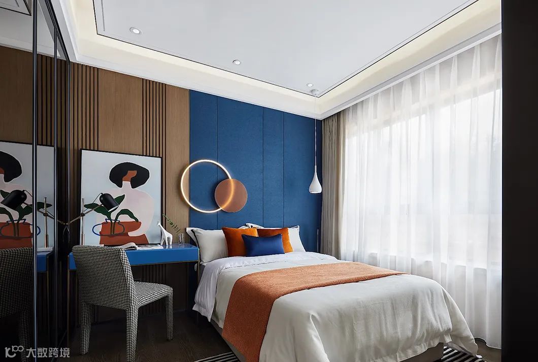 卧室空间通过不同色彩、材质的表达,饱有归属之意,囊括情感上的共鸣与空间所具备的舒适度,不仅从视觉上增添了趣味性,也从空间上提高了整体设计的延续性。