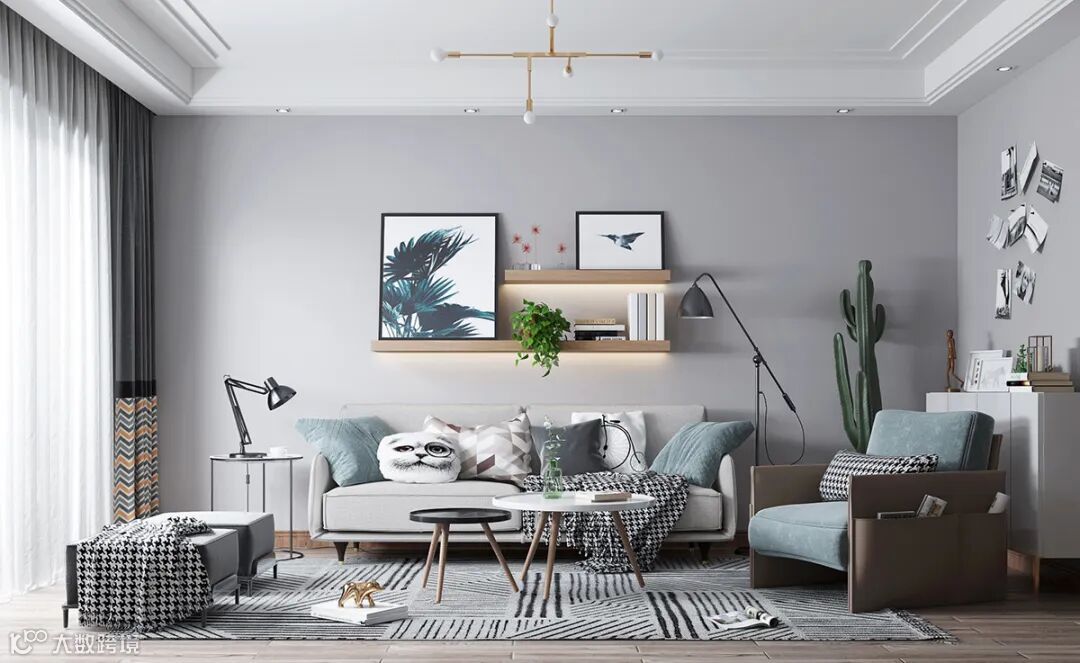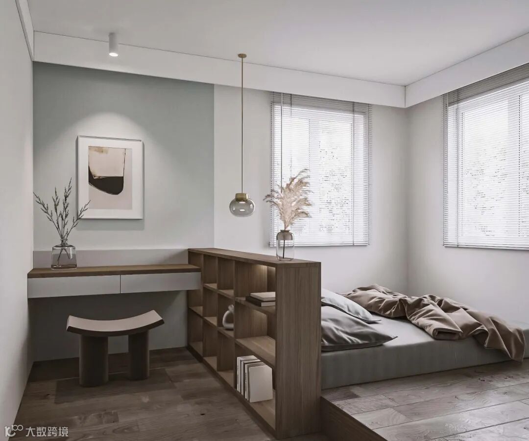 客厅区域可以用置物架做收纳,这样书籍、各样摆件就有了归处,同时保留了视线的通畅,不会对光源进行隔离。