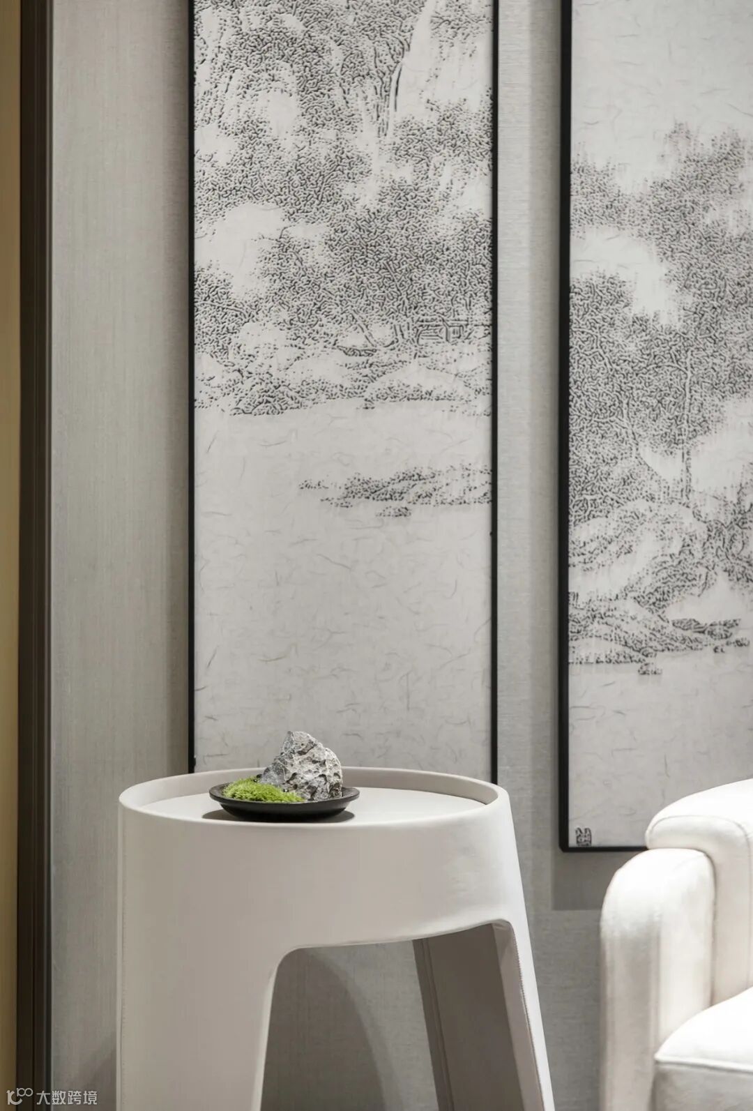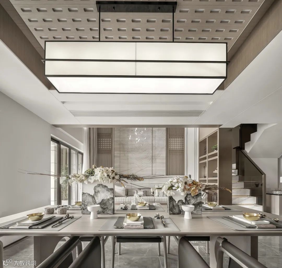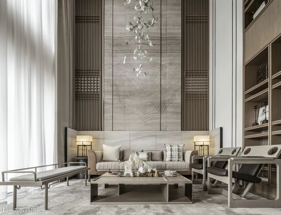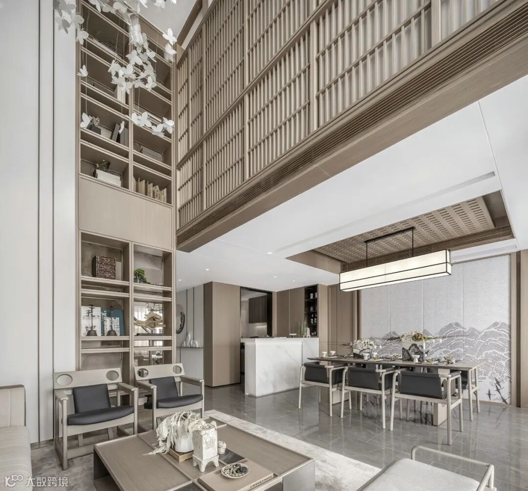 一步入玄关,“江涵秋影雁初飞,与客携壶上翠微”之景在众安宁静一偶静静等待着观者的到来。闭眼仿佛可听长空雁叫,睁眼隐然可观万羽翩跹,虚实相生是造景和装饰画的主色,这是一场空间和时间的对话。