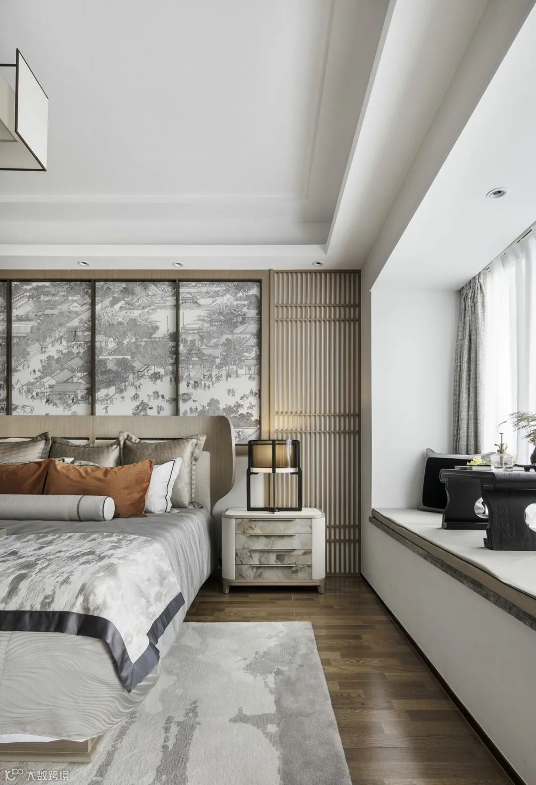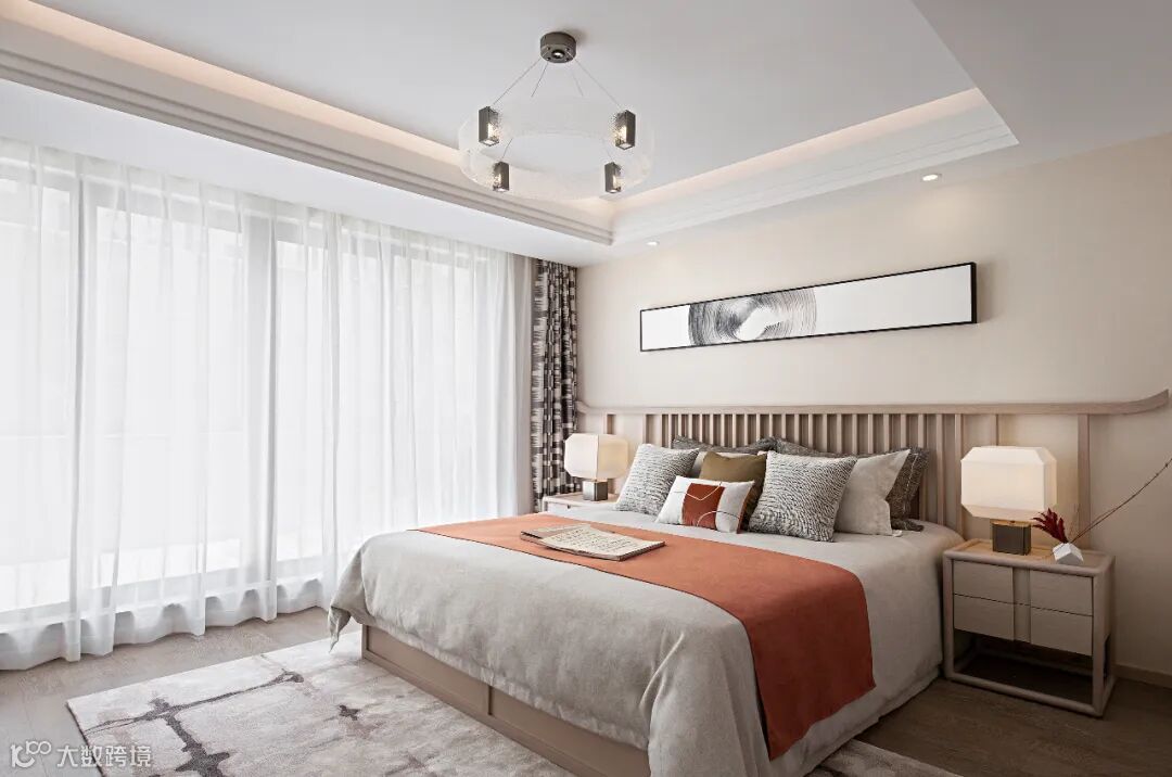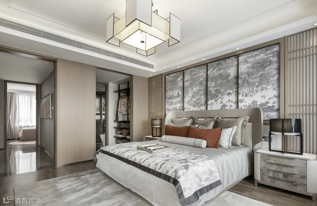 卧室背景以一幅风俗画徐徐展开,浅色木饰面为基调,搭配富有自然肌理感的石材家具,碰撞出富有人文气息且具现代品质感的诗意禅韵。