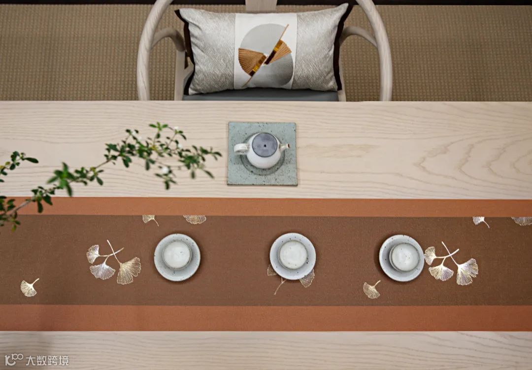 而这也成为本案设计师的色彩灵感来源,日系色谱中的“赤錆色”始终贯穿了整个软装设计的跳色来源,这个源自矿石的颜色,在本案中绽放出秋季一般温暖的色泽,体现出氤氲暖阳下,茶香染年华的禅意生活。