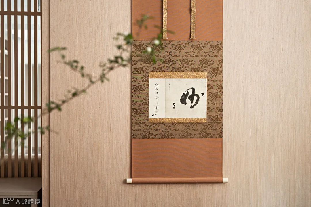 茶艺区的茶挂来源于日本茶圣——千利休所书写的一行书“妙”。 “妙”,用来表现一些抽象的内在肌理,而这些肌理当今依然无法明确解说,但人们却可以自然的体会到它的存在,这样奇特的、难以描摹的感受就自然而然用一字“妙”来表达。