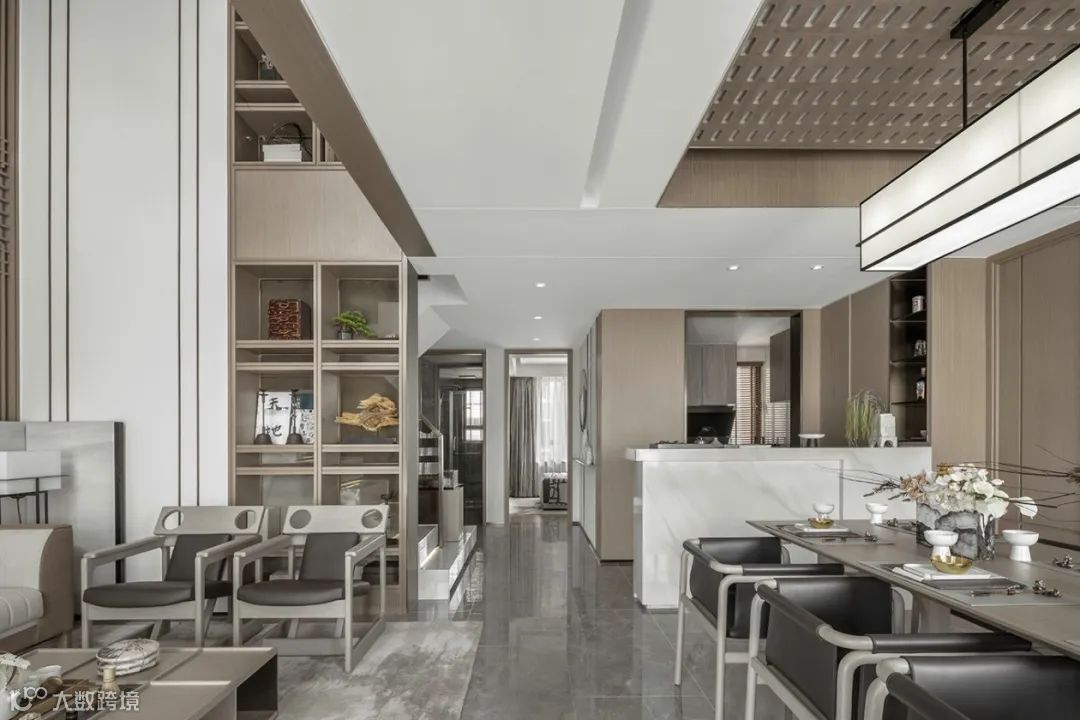 一层含有接待、聚会功能,在这层强调回归文韵礼序的宁静致远。就空间整体风格而言,偏向现代简约,设计语言采用直线条为主,块面的分割,给人通透干练的感受。