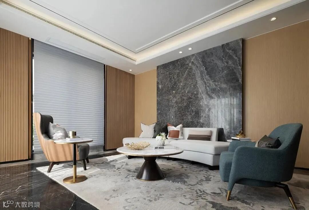 木饰面电视背景墙作为装饰材质,也可以带来一个自然舒适而大气的电视墙视觉感,也可以通过石材+木饰面的结合,让空间质感更加丰富精致。